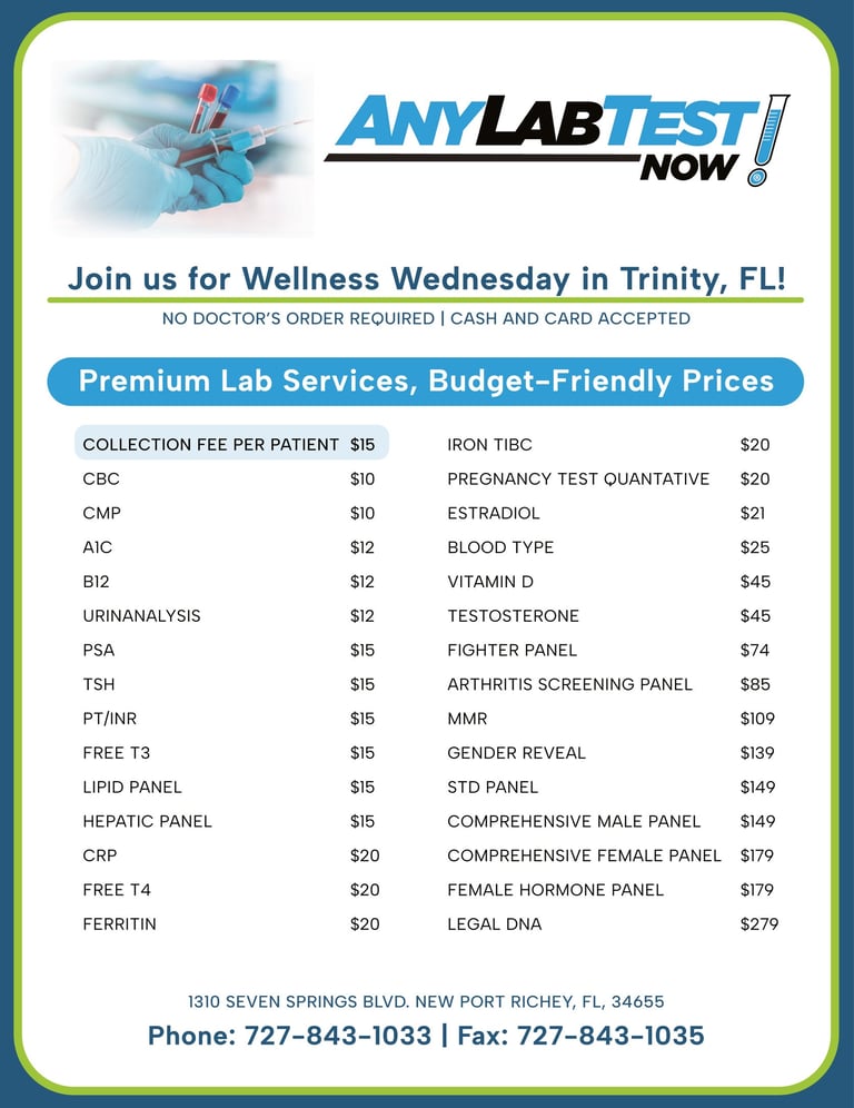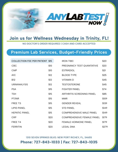 I led the real-client redesign for Any Lab Test Now in Trinity, FL, transforming their cluttered Wellness Wednesday social post into a clean, modern asset optimized for mobile. After auditing the original, I restructured the information into a two-column layout with ample white space, rounded content boxes, and a clear typographic hierarchy, ensuring pricing and key details scan briefly. I refreshed the color palette to brand-forward teal, blue, and white, enhanced the professional stock photo, and standardized font styles for clarity. The design underwent a focused redesign phase to further enhance layout and organization, during which I refined column widths, adjusted spacing, and streamlined headings for smoother visual flow.