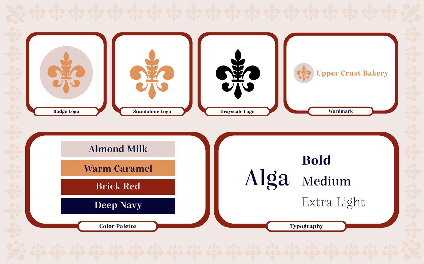 I developed the complete brand identity for Upper Crust Bakery, a fictional French-inspired bakery concept, using Adobe Illustrator to craft the “Wheat De Lis” logo by merging a stylized fleur-de-lis with wheat motifs. This custom emblem plays with line, shape, and form to feel both elegant and organic, and works seamlessly as a badge, standalone mark, or paired with the wordmark. I established a refined palette, soft red and deep navy-blue nodding subtly to the French flag, balanced by Almond Milk and Warm Caramel for warmth, and set type in the Alga family to marry readability with an elevated look. In laying out brand direction, I applied contrast and hierarchy in color blocking, used white space around the emblem to emphasize its regal roots, and repeated wheat patterns to introduce rhythm and unity without overwhelming the design.