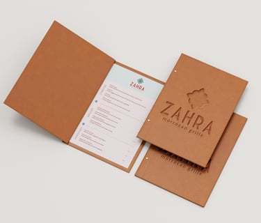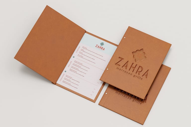 In this conceptual branding exercise for the fictitious Zahra Moroccan Grille, I used the full Adobe Creative Cloud suite to take the identity from initial concept to polished deliverables. In Illustrator, I developed a custom floral-geometric emblem, drawing on Moroccan tilework through precise Pathfinder operations and variable-width strokes, then enriched it with high-resolution textile-scan textures in Photoshop for depth without loss of clarity. In InDesign, I set up a flexible multi-column grid with master pages and linked styled text frames to create an easily updatable print menu. Throughout the process, I balanced line, shape, form, value, space, and texture to achieve striking contrast and unity, applied rhythmic patterned borders to guide the eye, and established a clear typographic hierarchy so diners naturally move from section headers to dish descriptions. Early ideation involved mood boards and hand-sketch clustering around the concept of “Zahra” as both flower and archway, ensuring an original emblem that respects cultural authenticity and ethical design practices.