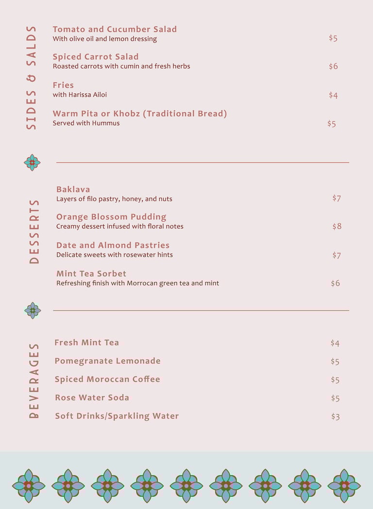 To refine the work, I reviewed the current work and identified room for improvement, then iterated on stroke weights and gutter widths as needed. I adhered to the hypothetical brief’s CMYK-friendly palette (teal, terracotta, emerald, light orange) inspired by Moroccan textiles and seamlessly adapted the menu format from trifold to bi-fold when the project scope shifted, all while preserving visual consistency and hierarchy. With meticulous kerning, linked high-resolution imagery, and strict grid alignment, every element in this speculative project reflects polished craftsmanship and advanced technical precision.