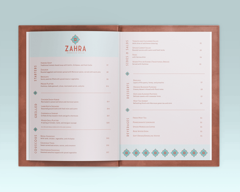RESULT: A cohesive brand direction that communicates authenticity, craftsmanship, and culinary delight, positioning Zahra as a memorable and premium dining experience.